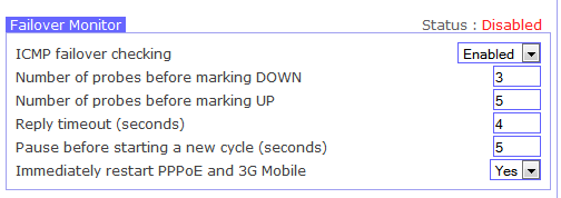 - Redémarrage immédiat des PPPoE et mobile 3G "Immediately restart PPPoE and 3G Mobile" : Lance une tentative de redémarrage sur une connexion qui est injoignable "Fault".