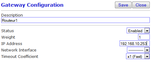 Le poids des passerelles n'a ici plus d’intérêt, car les deux traitent de façon égale les requêtes. Pour forcer le test de l'état de santé des routeurs, vous pouvez cliquer sur "Test" dans le panneau "Failover IP Addresses". Nous allons maintenant retirer une interface ou la désactiver (décocher la case "UP") du côté de nos routeurs pour voir comment réagit notre Zeroshell :