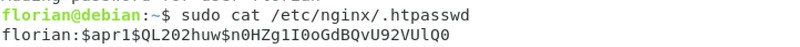 Une fois que c'est fait, nous allons créer un fichier qui va contenir un identifiant et un mot de passe. Ce fichier sera stocké dans "/etc/nginx/", se nomme ".htpasswd" et l'on va ajouter l'utilisateur "florian". Ce qui donne :