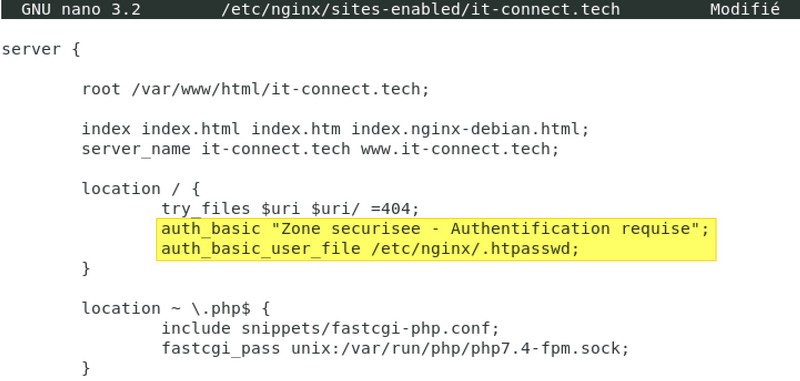 auth_basic "Zone securisee - Authentification requise"; auth_basic_user_file /etc/nginx/.htpasswd;