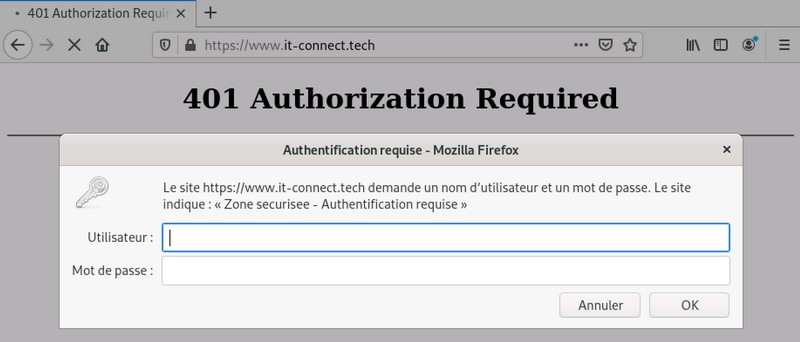 Dernière étape : tester que notre configuration bien. On se rend tout simplement sur notre site, et là une fenêtre d'authentification apparaît ! On doit se connecter avec un compte présent dans le fichier .htpasswd pour accéder au site, sinon on obtiendra une erreur : 401 Authorization Required.