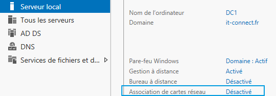 Ouvrez une session sur votre serveur et accédez au gestionnaire de serveur. Sur la gauche, cliquez sur "Serveur local". Sur la partie centrale, cliquez ensuite sur "Désactivé" à côté de "Association de cartes réseau".