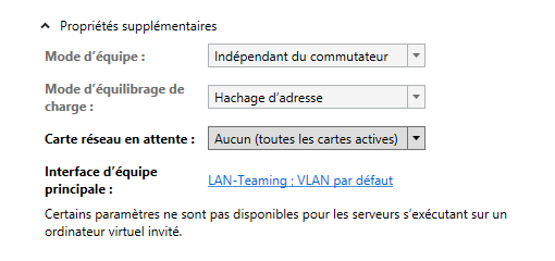 - Mode d'équipe : La valeur "Indépendant du commutateur" indique que le Teaming sera indépendant du commutateur auquel les cartes sont reliés, ce qui permet de relier les cartes à des commutateurs différents et donc d'augmenter la haute disponibilité puisque si un commutateur tombe, les paquets pourront passer par un autre chemin via le second commutateur. Quant au mode "Association statique" (IEEE 802.3ad), il requiert une configuration du serveur et du commutateur (il faut que les liens soient connectés au même commutateur) en se basant sur le principe d'une association statique. Enfin, "LACP" (IEEE 802.1ax) ou "Association dynamique" avec la mise en place du protocole LACP sur les ports du switch sur lesquels les cartes réseaux du Teaming sont connectées.