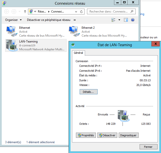 Suite à la mise en place de l'association de cartes réseaux, la configuration réseau des cartes a été effacée. Vous devez attribuer une adresse IP directement a une nouvelle interface créée et qui porte le nom de votre association, accessible depuis le gestionnaire de réseau Windows. L'ensemble des cartes réseaux d'une même équipe partage la même configuration réseau et donc la même adresse IP, afin que ce soit transparent pour les utilisateurs et, que la panne d'une carte ne remette pas en cause la disponibilité du serveur.