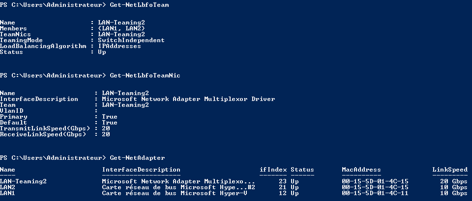 Pour finir, voyons quelques commandes PowerShell utiles pour obtenir la liste des équipes afin de voir si la notre est correctement créée (Get-NetLbfoTeam), de voir les propriétés de la carte réseau Teaming (Get-NetLbfoTeamNic) et de voir les différentes cartes réseaux du système et notamment la présence de la carte Teaming (Get-NetAdapter).