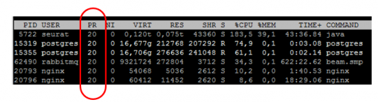Maintenant, une fois que l’on a ajusté la priorité d’un processus (ou de plusieurs selon les cas), il faut savoir où chercher la valeur de cette dernière. Il existe en fait une commande top listant l’ensemble des processus actifs, au niveau du système d’exploitation et dont la troisième colonne affiche leur priorité :