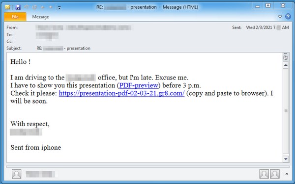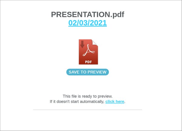 Actuellement, NimzaLoader est distribué dans le cadre d'une campagne par e-mail qui reprend d'anciennes conversations, notamment avec des noms de personnes et/ou d'entreprises. L'e-mail contient un lien pour, soi-disant, prévisualiser un PDF. En vérité, on atterrit sur une landing page avec un faux logo Adobe où l'on est invité à télécharger un PDF, sauf qu'il s'agit de l'exécutable de NimzaLoader. Le fichier exécutable quant à lui est hébergé directement sur Slack.