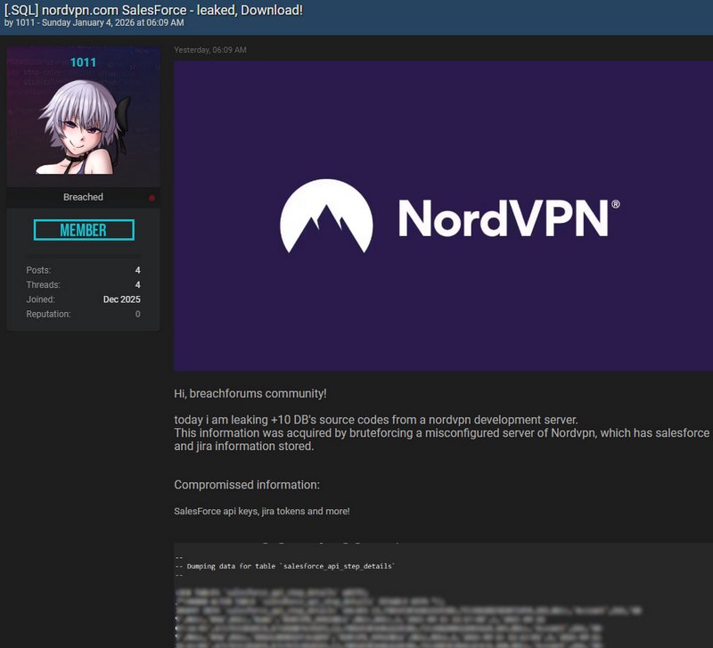 Comme bien souvent, l'alerte a été lancée sur BreachForums, un forum très apprécié par les cybercriminels. Cette fois-ci, le 4 janvier 2026, un pirate surnommé 1011 a mis en ligne un ensemble de données liées à NordVPN. Dans sa publication, le pirate affirme avoir réussi à exfiltrer des informations sensibles depuis un serveur de développement Salesforce interne à NordVPN.
