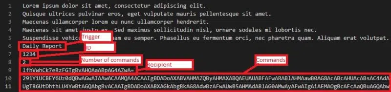 Lorsqu'un message contenant une chaîne de caractères prédéfinie (comme "Daily Report") est détecté, la porte dérobée s'active et interprète le contenu de l'e-mail comme une commande. Voici un exemple :