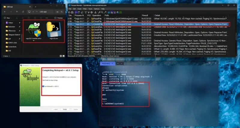 Ainsi, si un attaquant parvient à placer des exécutables piégés dans le répertoire où est téléchargé l'installeur de Notepad++, au hasard le répertoire "Téléchargements" du profil, l'installateur exécutera alors ces fichiers avec les privilèges SYSTEM. Ainsi, un attaquant peut exploiter cette vulnérabilité pour obtenir un contrôle total sur la machine.