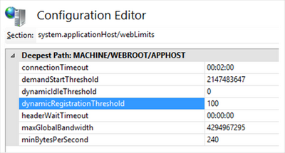 - Activation dynamique des sites : Lorsque vous hébergez une centaine de sites web sur un serveur IIS, le temps de chargement d'IIS était très long puisque la configuration est conséquente. Dans cette nouvelle version, un processus plus optimisé a été implémenté pour améliorer la performance en cas de forte activité. Cette fonctionnalité apparaît sous le nom de "dynamicRegistrationThreshold" dans l'éditeur de configuration et l'on ressent vraiment la différence lorsqu'il y a de nombreux sites hébergés. En fait, IIS activera un site que lorsqu'il recevera sa première requête.