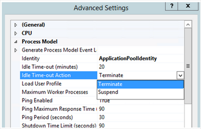 - Gestion de l'Idle des processus : Avant IIS 8.5, lorsqu'un processus en cours tourne au ralenti (Idle) pendant une période définie (20min par défaut), il était terminé. Désormais, l'administrateur a une option pour suspendre ou terminé cette notion d'Idle ce qui permet de rendre l'accès au site plus rapide et donc d'améliorer les performances.