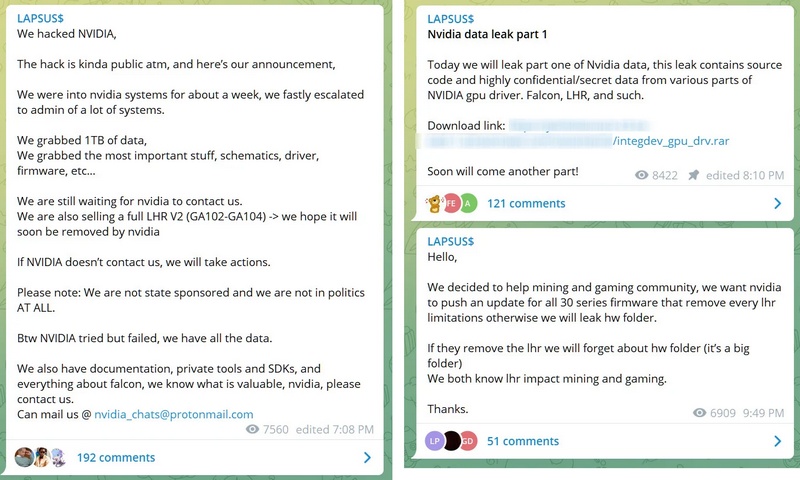 Le groupe LAPSU$ a également demandé à NVIDIA de s'engager à rendre open source ses pilotes de GPU, que ce soit pour Windows, macOS et Linux. Si ce n'est pas fait d'ici le vendredi 4 mars, c'est-à-dire aujourd'hui, des informations confidentielles seront publiées au sujet des GPU récents ou à venir, notamment le modèle RTX 3090Ti.