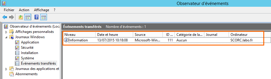 Dernière étape de la configuration : la création d'un abonnement pour récupérer les journaux du serveur SCORC depuis le serveur WIN12DC. On se connecte sur le serveur collecteur, et on accède à la console Observateur d'événements.