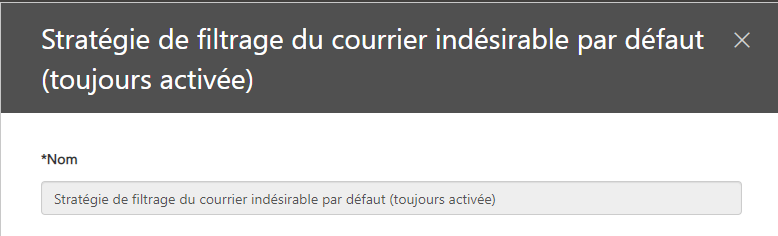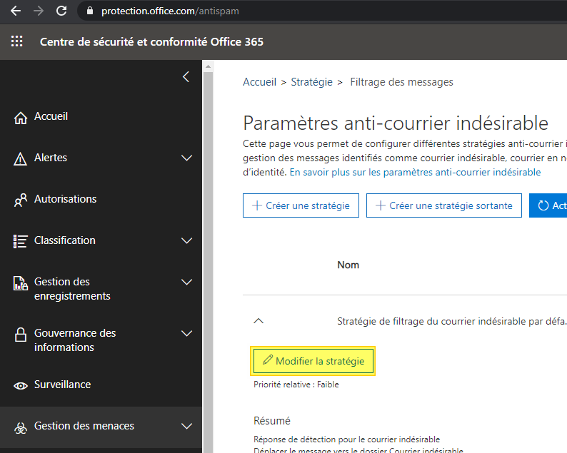 Je vous invite à cliquer sur la stratégie par défaut intitulée "Stratégie de filtrage du courrier indésirable par défaut" puis sur le bouton "Modifier la stratégie".