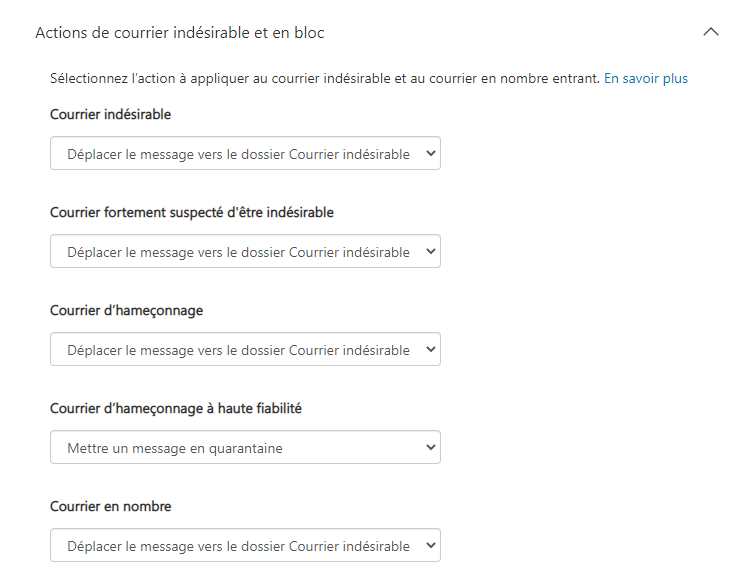 La partie "Actions de courrier indésirable et en bloc" ne nécessite pas, à mon sens, d'être modifiée. Elle permet de constater que les différents e-mails considérés comme spam seront déplacés vers le dossier "Courrier indésirable" de la boîte aux lettres. A l'exception près des courriels de type phishing qui seront directement placés en quarantaine.