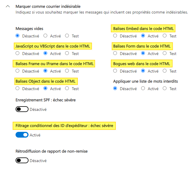 En complément, activez l'option "Filtrage conditionnel des ID d'expéditeur : échec sévère" afin d'éviter les expéditeurs falsifiés.
