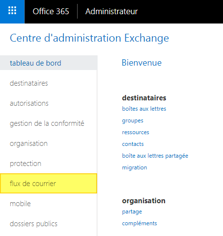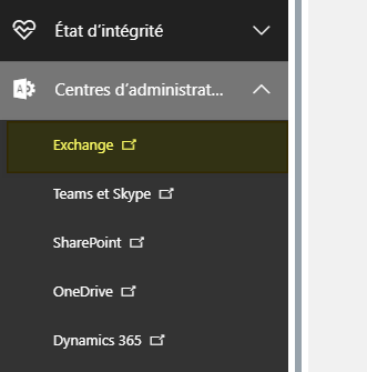 Vous devez utiliser un compte admin sur le tenant O365 pour réaliser cette action. Dans le centre d'administration, accédez à "Exchange" dans le menu, comme ceci :