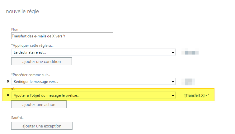 Sélectionnez l'action "Ajouter à l'objet du message le préfixe" et sur la droite cliquez pour indiquer votre texte, par exemple : "[Transfert X] - ". Vous verrez qu'il est possible d'ajouter d'autres actions, et aussi d'indiquer à partir de quand et jusqu'à quand cette règle est-elle valable, si elle doit être toujours active dans le temps, n'indiquez pas de date.