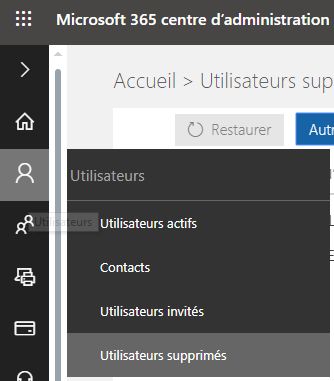 La procédure via le centre d'administration étant très simple (Utilisateurs > Utilisateurs supprimés), nous allons plutôt voir comment procéder avec PowerShell pour restaurer l'utilisateur.