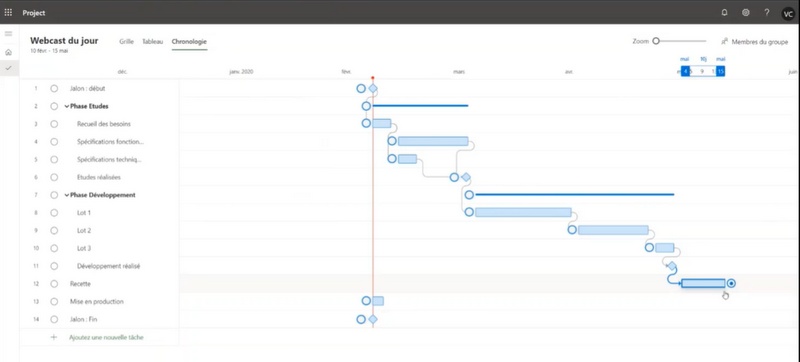 Dans le même esprit que Planner, une vue par compartiment est proposée, mais nous retrouvons des vues classiques et adaptées à la gestion de projets : grille, tableau et chronologique. Par la suite, Microsoft prévoit d'intégrer de nouvelles fonctionnalités à Project for the web, notamment pour la gestion financière ainsi que la gestion des ressources.