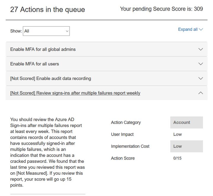 Pour chaque action, Microsoft indique l'impact pour l'utilisateur ainsi que le coût d'implémentation. Vous pourrez aussi accéder à une courbe qui retracera l'évolution de votre security score au fil du temps, le but étant de le faire progresser au maximum.