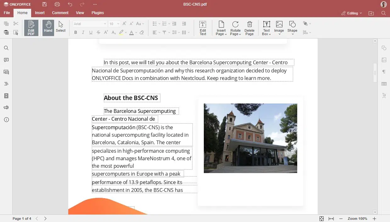 ONLYOFFICE Docs 8.1 intègre un éditeur plus complet pour un format de document très populaire : le format PDF. Cet éditeur natif permet de visualiser des documents PDF, mais aussi de les éditer directement. L'utilisateur peut éditer le texte, modifier les pages et la structure du document PDF (rotation, suppression, ajout), ainsi qu'insérer des objets divers et variés : images, formes, tableaux, etc.