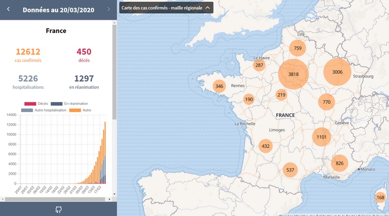 Rendez-vous sur le site veille-coronavirus.fr afin de visualiser la carte de France avec les données liées au Coronavirus : nombre de cas confirmées, d'hospitalisations, de décès ou encore le nombre de personnes en réanimation. Cela permet de suivre la progression du virus en France grâce à une vue synthétique sur une carte Open Street Map, en se basant sur les données officielles et récoltées à partir de différentes sources.