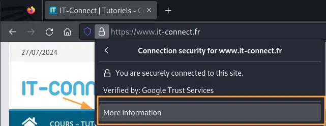 Vous êtes ici informé que le site web sur lequel vous naviguez dispose bien d'un certificat SSL et s'il est considéré comme valide. Accédez ensuite à la section "More Information / Plus d'informations" :