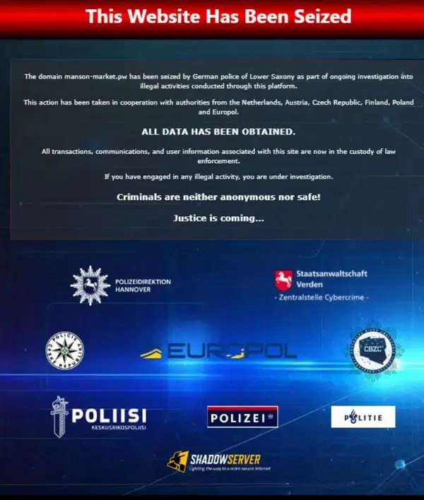 Après Crimenetwork, les autorités ont mené une autre opération importante dans le but de mettre à mal la marketplace Manson Market. Portée par Europol, cette action a été menée par l'Allemagne, ainsi que d'autres pays : l'Autriche, la République Tchèque, la Finlande, les Pays-Bas et la Pologne.