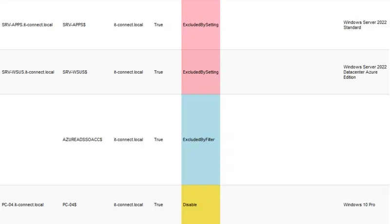 Dans ce cas, il convient d'ajouter le paramètre "-Exclusions" qui accepte une ou plusieurs valeurs, afin d'exclure cette machine. Il est aussi possible de jouer sur le paramètre "-Filter" pour injecter un filtre directement dans la commande "Get-ADComputer".