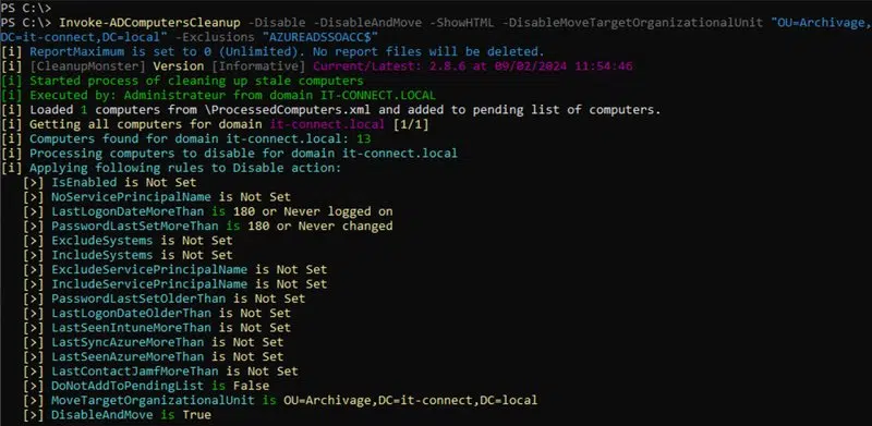 La commande ci-dessus va désactiver les comptes ordinateurs inactifs puis les déplacer dans l'OU "OU=Archivage,DC=it-connect,DC=local" (dans cet ordre). Il est essentiel de spécifier ensemble "-Disable -DisableAndMove" car "-DisableAndMove" n'est pas un mode à proprement parler.