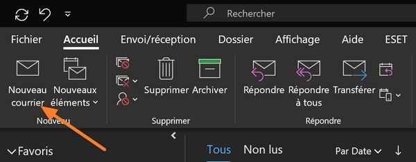 Dans mon exemple, j'utilise Outlook via les applications Microsoft 365 mais cela fonctionne également pour les versions classiques d'Office telles qu'Office 2016 et Office 2019. Ouvrez le client Outlook sur votre machine et cliquez sur le bouton « Nouveau courrier ».
