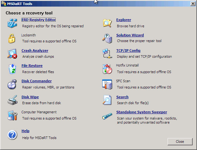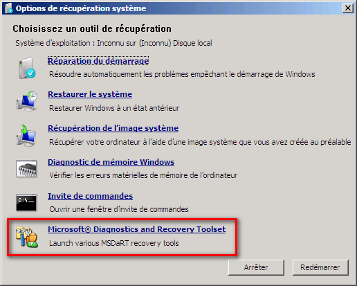 En toute franchise, j’aurais donc tendance à me limiter et m’inspirer de l’outillage offert par DaRT (Diagnosis And Repair Toolkit) fournit aux entreprises ayant souscrit un contrat Software Assurance MDOP (Microsoft Desktop Optimisation Pack).