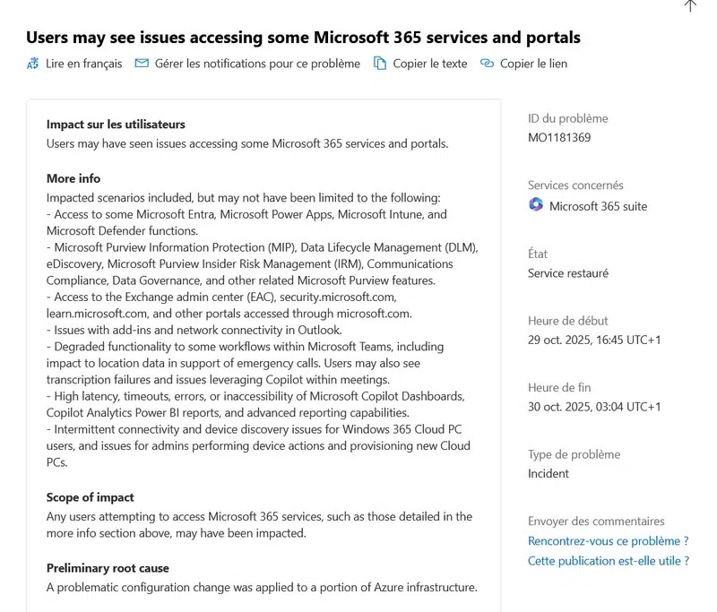 Cette panne a été suivie chez Microsoft via l'incident MO1181369 sur Microsoft 365 et l'incident YKYN-BWZ sur Azure.