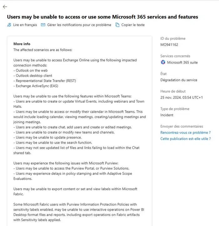 Microsoft va actualiser le suivi du ticket à 15:00. D'ici-là, il y a des chances pour que le problème soit résolu puisque la cause a été identifiée. Si vous avez accès au portail Microsoft 365, vous pouvez cliquer sur ce lien pour accéder au ticket.