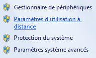 Démarrer, Clic droit sur Ordinateur ou Poste de travail, Propriétés, Paramètres d'utilisation à distance