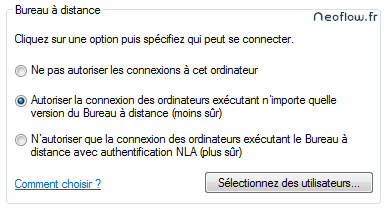 Il y a deux types d'accès, le premier autorise n'importe qu'elle version du Bureau à distance à se connecter à cet ordinateur, c'est à dire que tous les clients ayant l'application pourront y accéder.