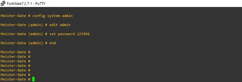 2. L'étape suivante consiste à attribuer un nouveau mot de passe à l'administrateur. On rentre d'abord la commande config system admin. Ensuite, on choisit de modifier le compte-cible avec la commande edit admin. On modifie le mot de passe avec la commande set password <insérer un mot de passe robuste> et on valide le tout avec la commande end. On peut éventuellement se déconnecter avec la commande exit.