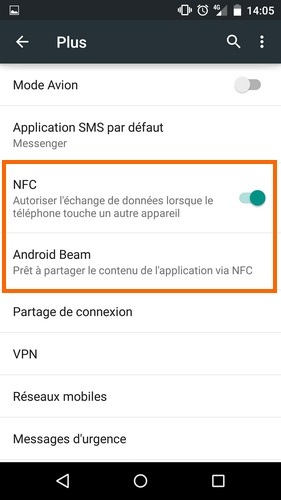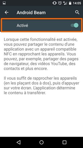 Activez la NFC et appuyez sur Android Beam, comme ceci :
