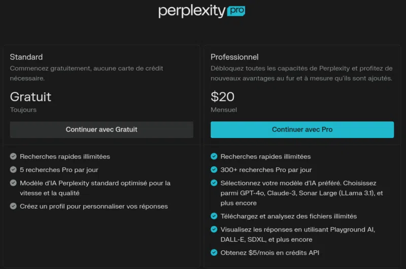 Perplexity est disponible sous un modèle freemium. Il est utilisable gratuitement et sans publicité, mais une version payante existe pour accéder à des fonctionnalités avancées : utilisation de modèles LLM plus récents, envoi et analyse de fichiers, génération d’images avec d’autres IA génératives et utilisation de l’API (sans doute le plus intéressant) :