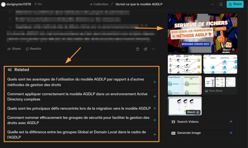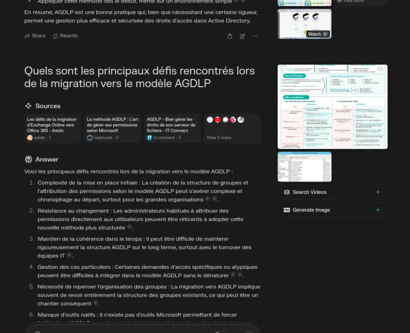 Ainsi, nous pouvons poursuivre notre recherche en utilisant ces prompts, ou en rédigeant, nous-même, une seconde question ou une demande de précision. Par exemple, je demande ici plus d'informations sur les problématiques courantes liées à la migration vers AGDLP :