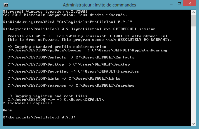 Une fois le profil modèle créé, on l’utilisera pour écraser le Default User en place. Afin d’éviter les copier-coller dans tous les sens, nous utiliserons l’utilitaire en ligne de commande « ProfileTool ».