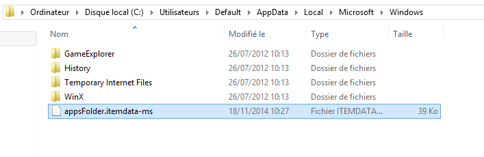 Pour personnaliser l’écran d’accueil dans le Default User, il est nécessaire de récupérer un fichier de configuration. Ce fichier nommé « appsfolder.itemdata-ms » est disponible au chemin suivant pour chaque utilisateur :
