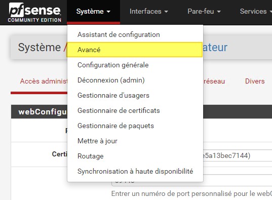Connectez-vous à l'interface d'administration de pfsense, et dans le menu "Système" cliquez sur "Avancé".