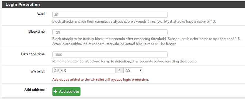 - Whitelist : indiquez une ou plusieurs adresses IP de machines (ou un réseau) que vous souhaitez mettre en liste blanche, donc sur lequel la protection ne s'appliquera pas