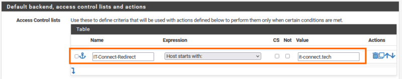 Un peu plus bas dans la page, nous devons créer une ACL afin d'appliquer la règle lorsqu'un internaute accède au site "it-connect.tech". Pour cela, nous pouvons nommer l'ACL "IT-Connect-Redirect", avec l'expression "Host starts with:" (ou match) et le domaine comme valeur.