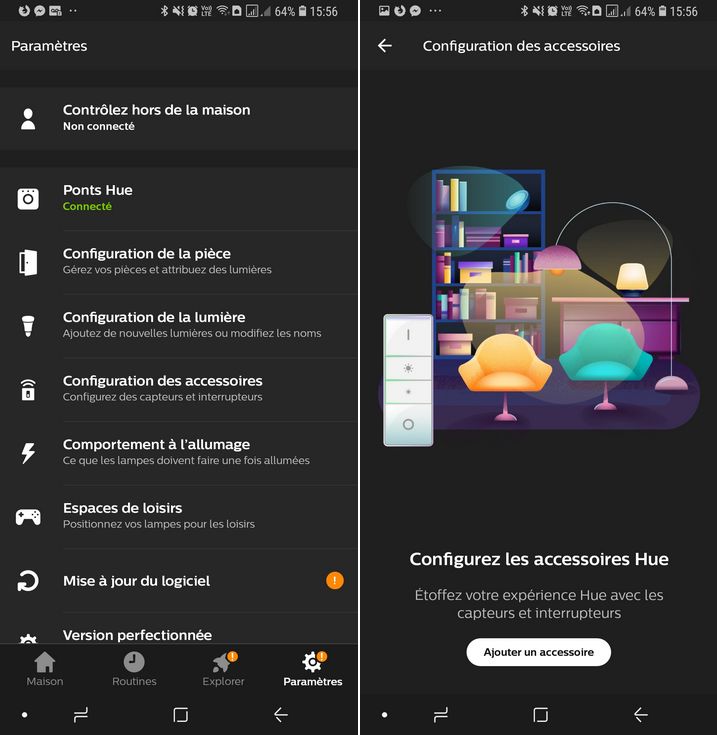 A partir de votre smartphone, connecté sur le même réseau que votre pont Philips Hue (indispensable à la configuration), nous allons configurer un nouvel accessoire. Dans l'application, allez dans "Configuration des accessoires" et appuyez sur "Ajouter un accessoire".