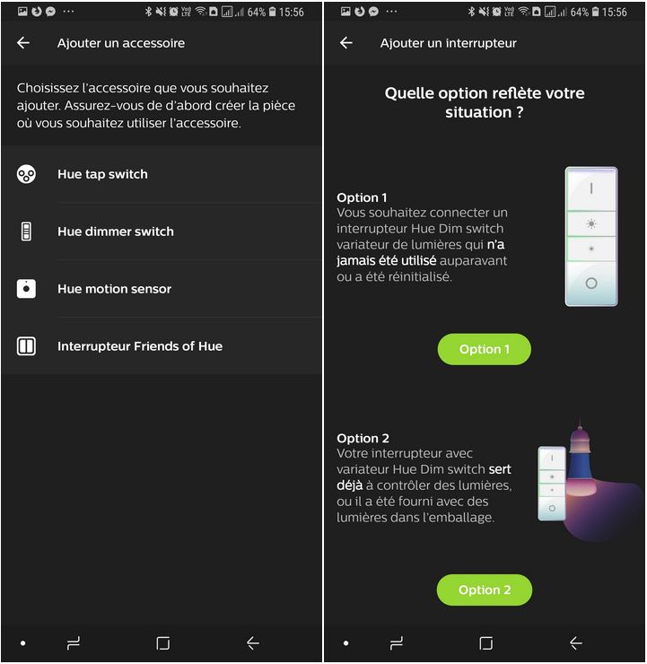 Sélectionnez ensuite "Hue dimmer switch" qui correspond à notre appareil, et prenez ensuite l'option 1 car il s'agit d'un interrupteur neuf (enfin en théorie 🙂 ).