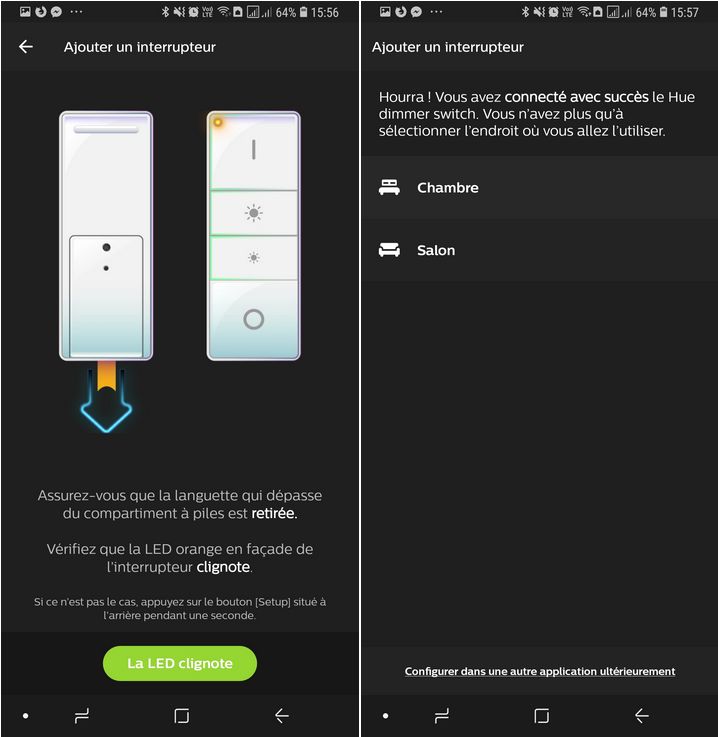 Comme je vous l'ai dit précédemment, il faut retirer la languette plastique... La LED sur la télécommande doit alors clignoter orange, si c'est bien le cas appuyez sur "La LED clignote". La prochaine étape consiste à indiquer à quelle pièce vous souhaitez l'associer, ici "Chambre" ou "Salon" car ce sont les deux pièces configurées sur mon installation.